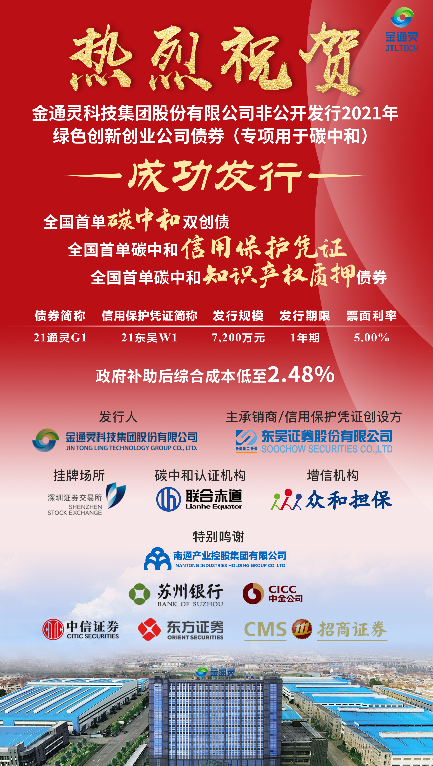 8月18日,南通產業(yè)控股集團控股的上市公司金通靈科技集團股份有限公司(SZ.300091,金通靈)非公開發(fā)行2021年綠色創(chuàng)新創(chuàng)業(yè)公司債券(專項用于碳中和)成功發(fā)行。債券簡稱“21通靈G1”,債券代碼“133055”,發(fā)行規(guī)模7200萬元,綜合融資成本年化僅為2.48% 。實現了3個全國首單,即全國首單碳中和知識產權質押債券,全國首單使用知識產權為債券提供質押擔保且募集資金用于碳中和領域的債券;全國首單碳中和雙創(chuàng)債券,全國首單創(chuàng)新創(chuàng)業(yè)公司發(fā)行的募集資金用于碳中和領域的債券;全國首單碳中和信用保護憑證,在南通眾和擔保提供全額擔保的基礎上,東吳證券為本次債券提供信用保護憑證,支持綠色知識產權質押實體企業(yè)融資發(fā)展,專項用于碳中和,在全國尚屬首次。本輪債券募集資金70%將用于中天鋼鐵綠色精品鋼項目余熱利用碳中和項目,30%用于如皋大型工業(yè)鼓風機新建項目。